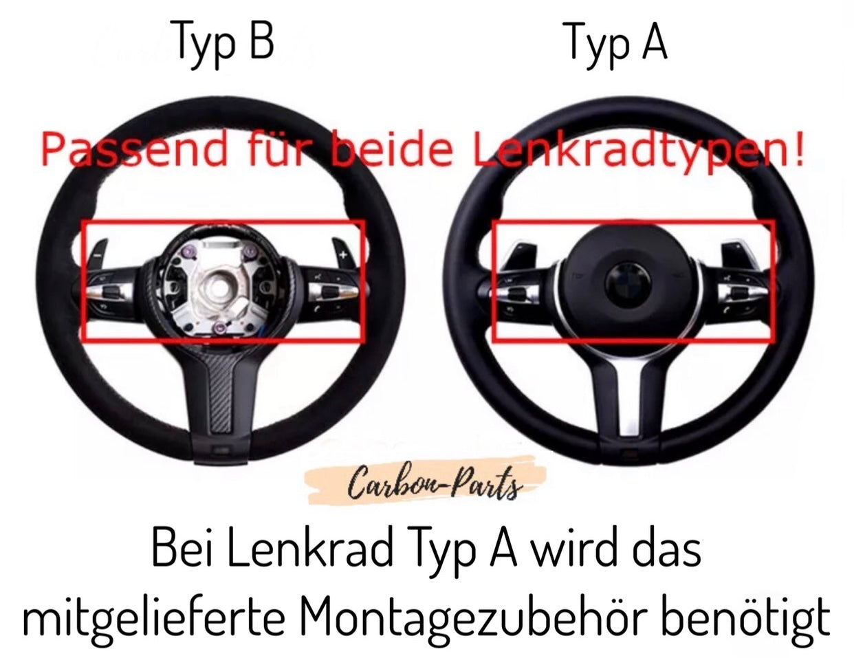 Echt-Carbon Schaltwippen Verlängerungen inklusive Montagezubehör für beide Lenkradmodelle der F-Serie.